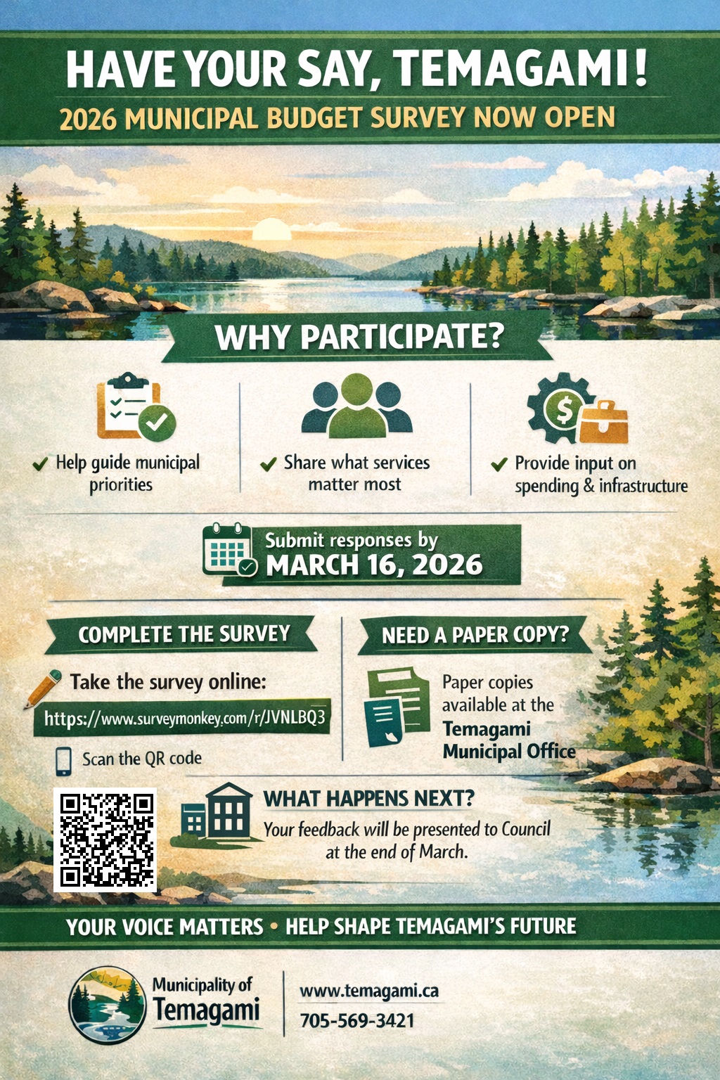 Responses to the Municipality of Temagami’s “Budget Survey” can be submitted until March 16, 2026 at: www.surveymonkey.com/r/JVNLBQ3